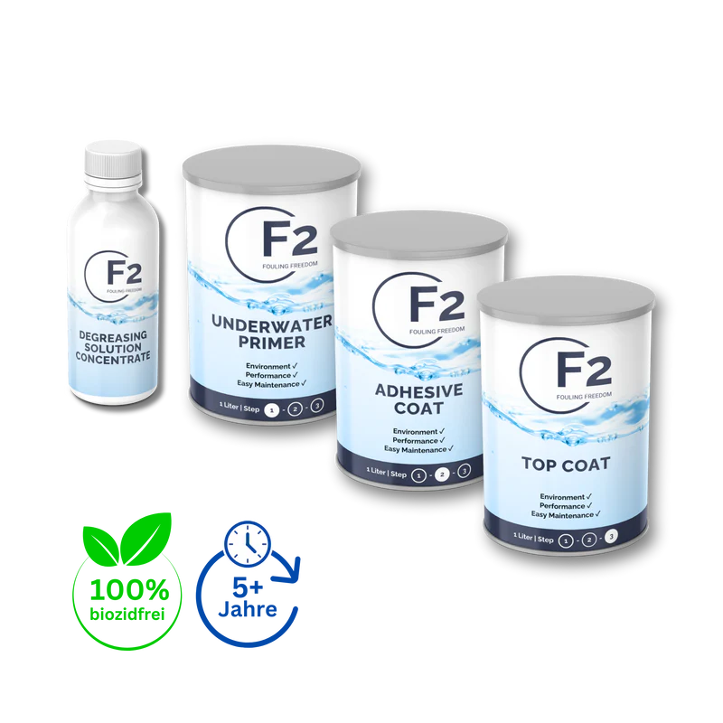 F2 EcoHull je 100-odstotno okolju prijazna alternativa klasičnim antifouling premazom, zasnovana za dolgotrajno in zanesljivo zaščito trupa plovila pred obraščanjem. Inovativna tehnologija ustvarja izjemno gladko, nelepljivo površino, ki preprečuje oprijem alg, školjk in drugih morskih organizmov, hkrati pa zmanjšuje upor vode in izboljšuje učinkovitost plovbe. Ob pravilnem nanosu in rednem vzdrževanju zagotavlja zaščito več kot 5 let, brez sproščanja škodljivih snovi v okolje. F2 EcoHull predstavlja trajnostno, učinkovito in stroškovno ugodno rešitev za lastnike plovil, ki želijo dolgoročno zaščito in manj vzdrževanja.